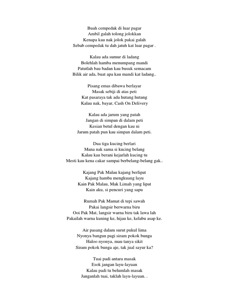 Kalau ada sumur di ladang Bolehlah hamba menumpang mandi Kalau ada. Buah cempedak di luar pagar Ambil galah tolong jolokkan. Rama-ra ma cantik ikan ke li sayang.
